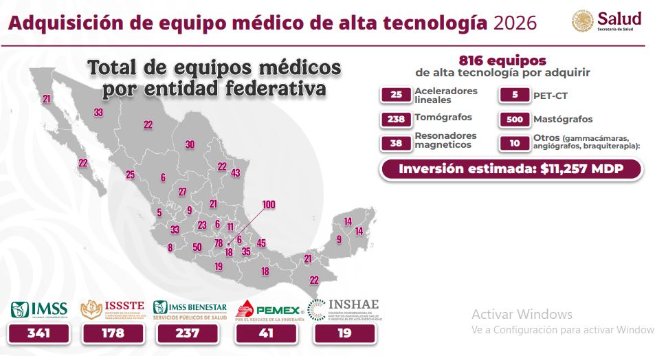 El Gobierno de México, a través de la Secretaría de Salud, adquirirá 816 equipos médicos de alta tecnología con una inversión de 11 mil 257 millones de pesos (mdp).