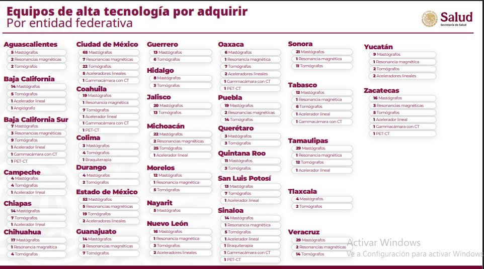 El subsecretario de Integración Sectorial y Coordinación de Servicios de Atención Médica, Eduardo Clark García Dobarganes, detalló que se trata de 25 aceleradores lineales para el tratamiento de cáncer, 238 tomógrafos; 38 resonadores magnéticos; cinco PET-CT (tomografía por emisión de positrones-tomografía computarizada) relevante para cáncer; 500 mastógrafos y 10 equipos entre ellos gammacámaras, angiógrafos y braquiterapia.