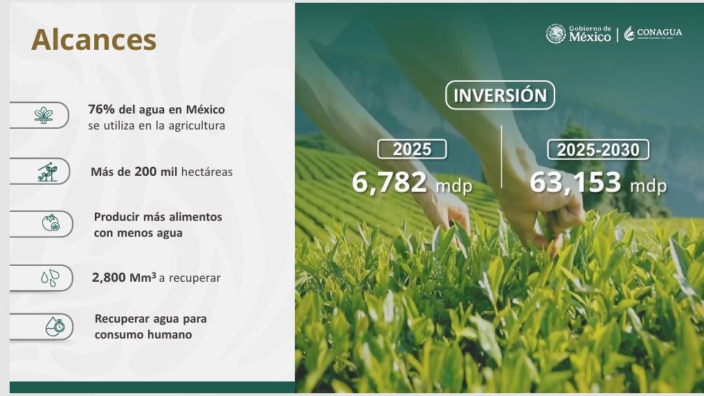 La presidenta de México, Claudia Sheinbaum Pardo, destacó que México se Tecnifica es un programa histórico e inédito que se realiza en acuerdo con los agricultores y tiene el objetivo de recuperar el triple de agua que se consume anualmente en la Ciudad de México y distribuirla en zonas urbanas para garantizar como un derecho el acceso al agua.