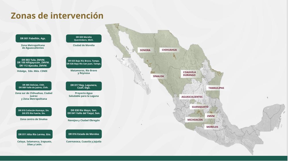 Puntualizó que, de los Distritos de Riego que serán intervenidos, están en marcha seis: de Sinaloa los distritos 010 Culiacán-Humaya y 075 Río Fuerte; de Tamaulipas los distritos 025 Bajo Río Bravo y 026 Bajo Río San Juan; así como de Guanajuato el distrito 011 Alto Río Lerma; y de Aguascalientes el 001 Pabellón.