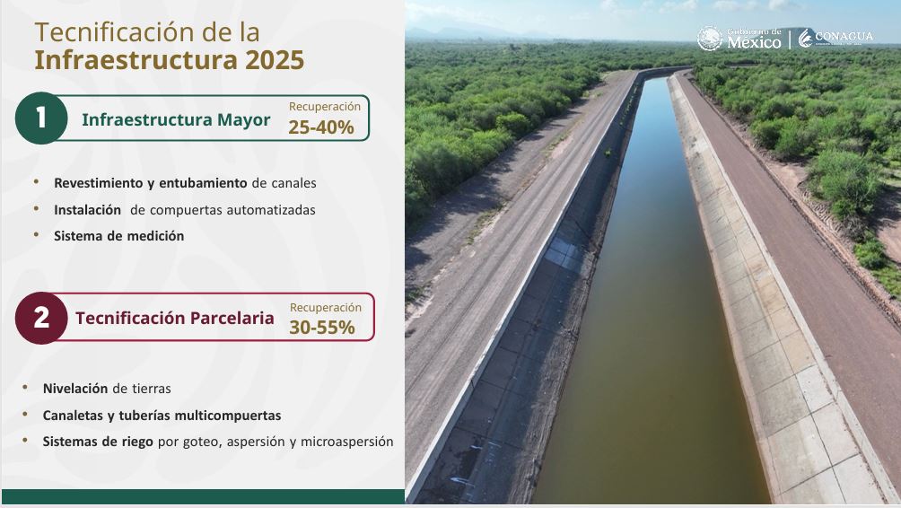 El subdirector general de Infraestructura Hidroagrícola, Aarón Mastache Mondragón, detalló que por medio de la tecnificación se atenderán canales deteriorados, canales de tierra, presas derivadoras dañadas, compuertas en mal estado y parcelas de agua rodada. Explicó que, México se Tecnifica tiene dos componentes: