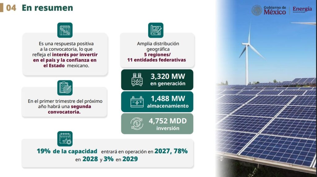 “El próximo año, en total estamos hablando de alrededor de 6 mil MW nuevos de energía que se van a generar y una parte muy importante con fuentes renovables de energía. ¿Qué garantizamos? 54 por ciento (de la generación eléctrica) el Estado mexicano y 46 por ciento los privados, en este nuevo esquema, que tiene orden, tiene planeación y tiene garantía, incluso para el privado que quiere generar y ganó un concurso, eso es lo que estamos anunciando el día de hoy”, explicó en la conferencia matutina: “Las mañaneras del pueblo”.