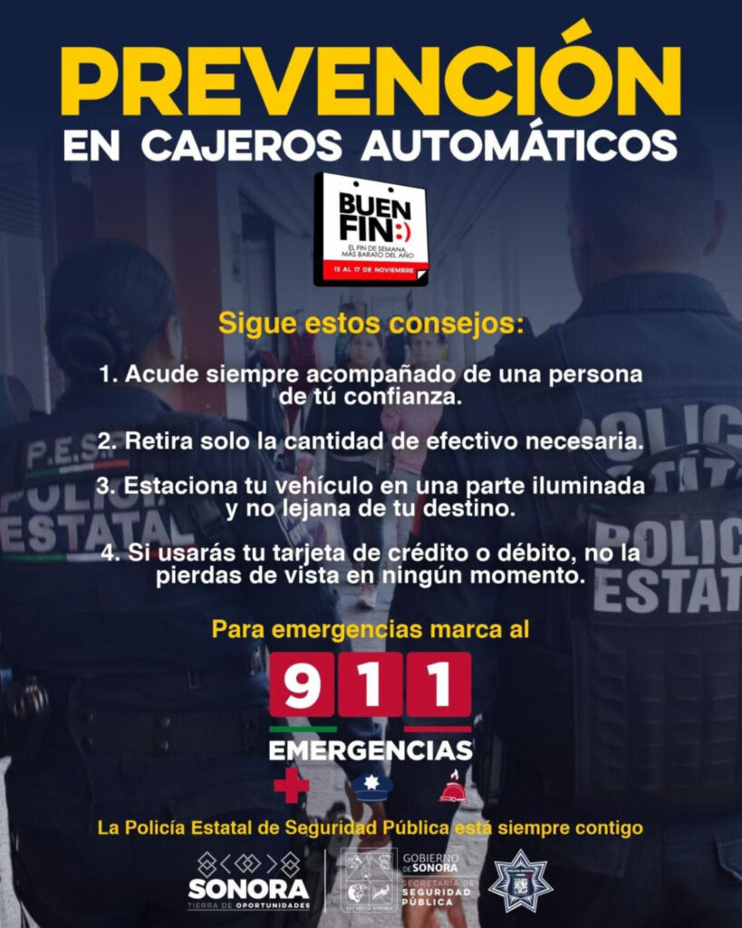 Para que la ciudadanía realice un retiro seguro de efectivo y prevenir sean víctimas de delitos, la Secretaría de Seguridad Pública (SSP) de Sonora compartió una serie de recomendaciones de utilidad al momento de acudir a los cajeros electrónicos.