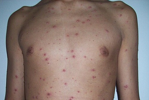 También pueden aparecer lesiones iniciales en la piel que posteriormente evolucionan a las típicas ronchas con líquido.