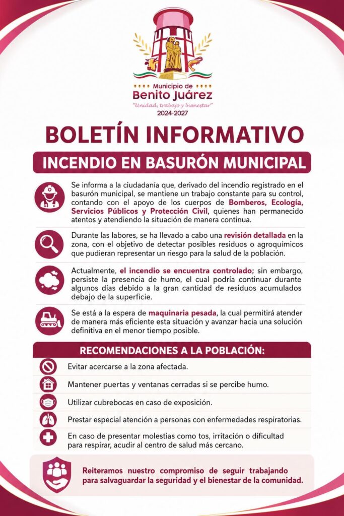 El Ayuntamiento de Benito Juárez informó que fue contralado oficialmente el incendio que se registraba desde el pasado 23 de abril en el basurón municipal y que generó molestias en la población.