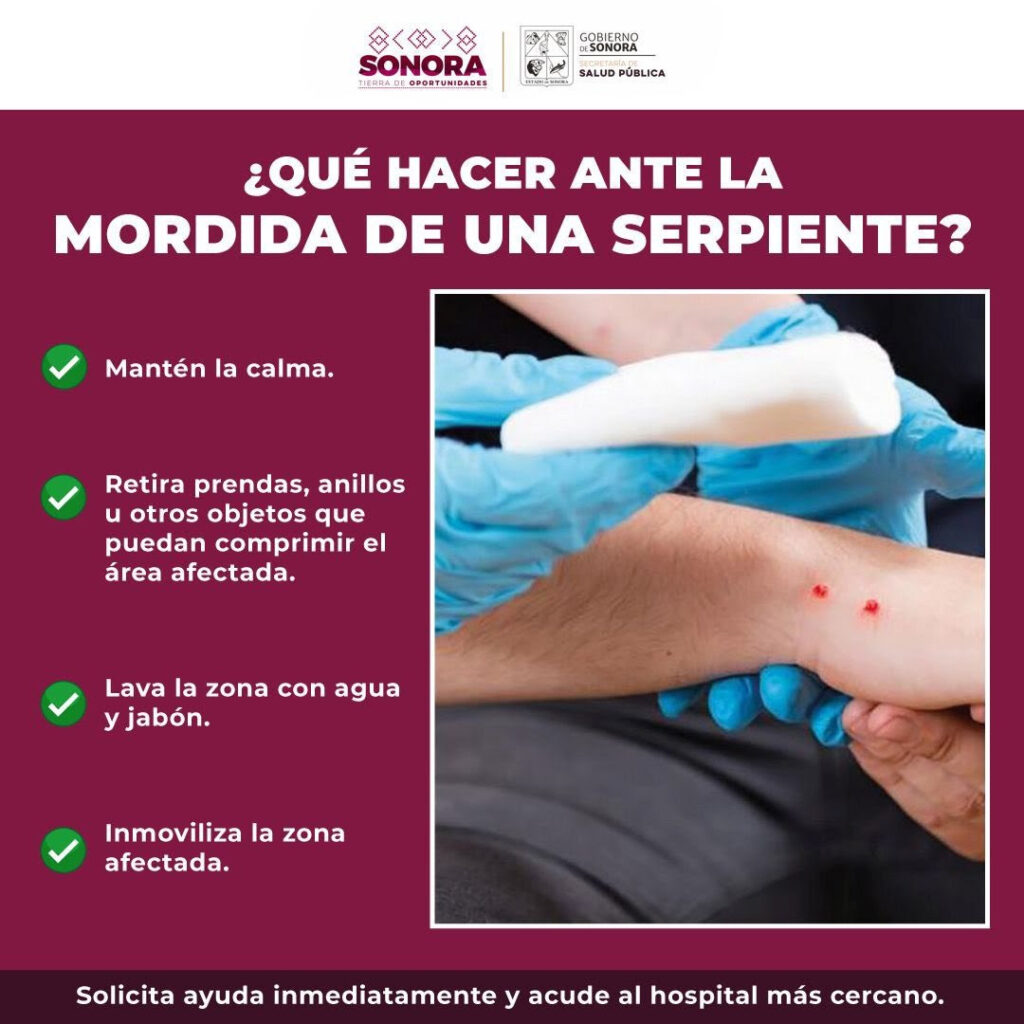 La Secretaría de Salud Pública de Sonora exhorta a la población a prevenir accidentes por mordedura de serpiente y a actuar de manera oportuna ante una emergencia.