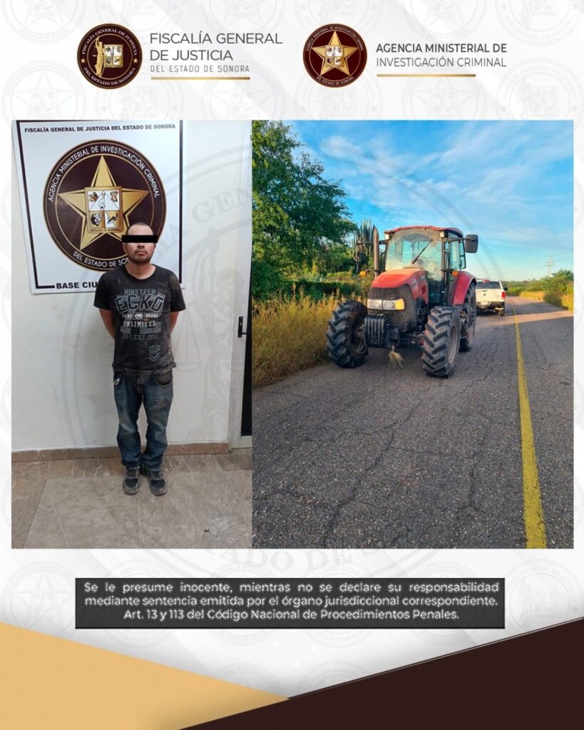Elementos de la Agencia Ministerial de Investigación Criminal (AMIC) ejecutaron una orden de aprehensión contra Juan Manuel “N”, de 36 años, alias “Güero” y/o “Chapo”, por su probable responsabilidad en el delito de robo de vehículo de propulsión mecánica (maquinaria agrícola) cometido con violencia en las cosas, de noche y por dos personas.