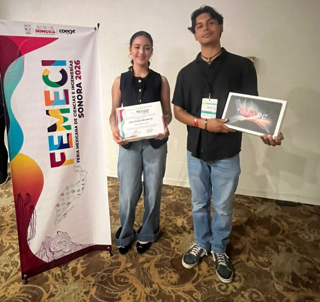 Los estudiantes Jackie Michel Durazo Moreno y Everardo Romero Galindo, del Colegio de Estudios Científicos y Tecnológicos del Estado de Sonora (Cecyte), plantel Granados, obtuvieron el tercer lugar en el Concurso Nacional de la Feria Mexicana de Ciencias e Ingenierías (Femeci) 2026, realizado del 10 al 13 de marzo en San Carlos.