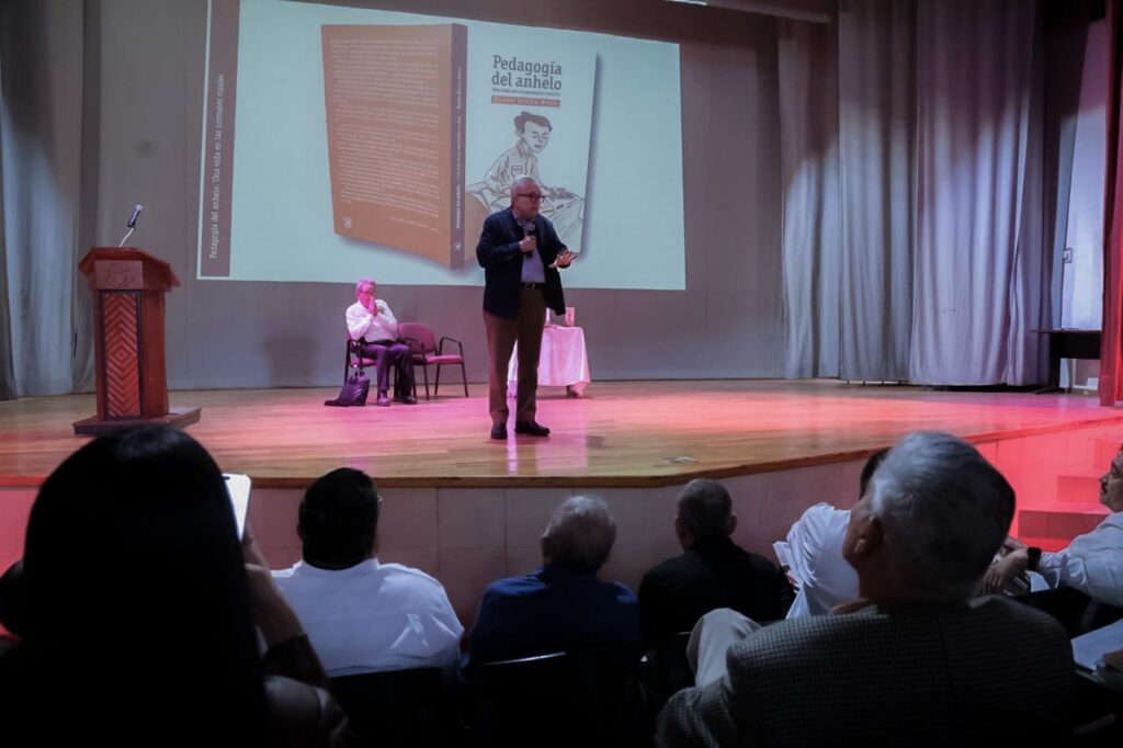 Rubén Rocha Moya presentó en las instalaciones del plantel escolar su nuevo libro “Pedagogía del anhelo. Una vida en las normales normales”, en el cual señala “compartir los caminos, las voces y los momentos que marcaron mi formación como docente”.