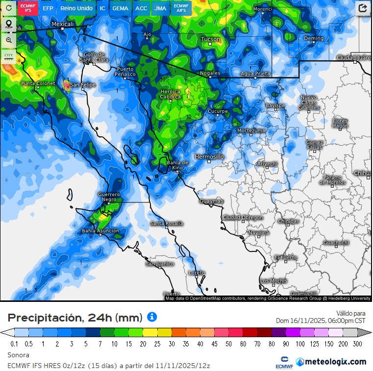 Dicho sistema, en interacción con una vaguada polar y una circulación ciclónica en altura, generará vientos fuertes a muy fuertes (+70 km) con tolvaneras, marcado descenso de las temperaturas, además de probabilidad de chubascos y lluvias moderadas con puntuales fuertes (5 a 45mm) y acompañadas de descargas eléctricas en Sonora.