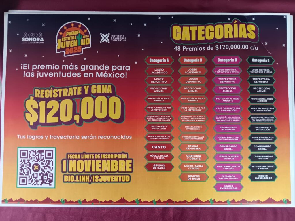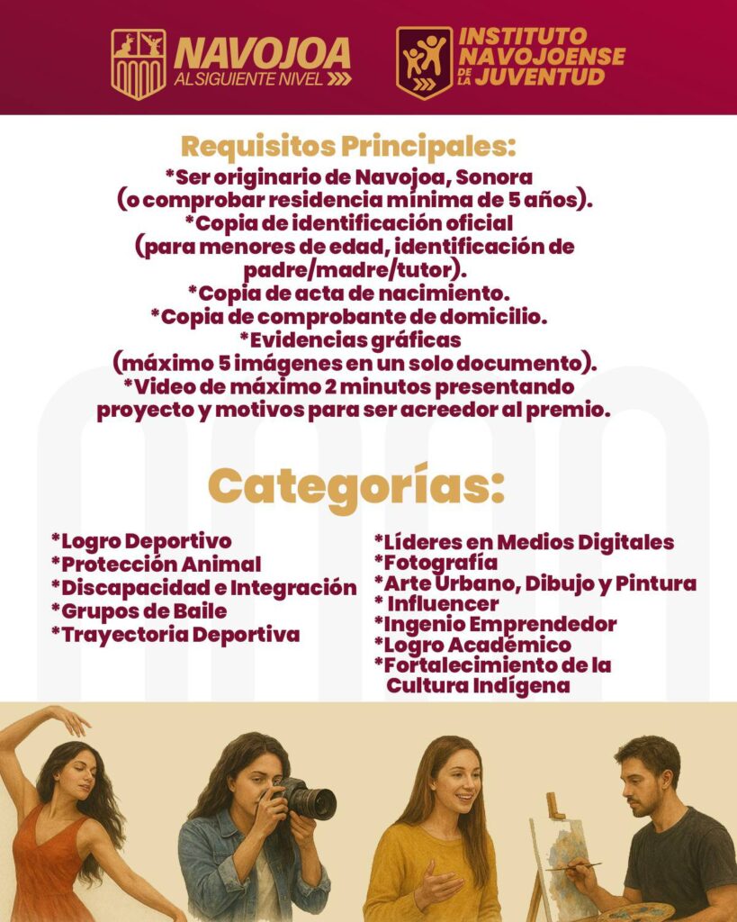 Los institutos Navojoense de la Juventud (INJ) ySonorense de la Juventud (ISJ), invitación a personas de 12 a 29 años de edad, a inscribirse a la competencia de talentos de los Premios Municipal y Estatal y de la Juventud 2025, cuyos 48 ganadores, en diferentes categorías y temáticas, recibirán 120 mil pesos cada uno.