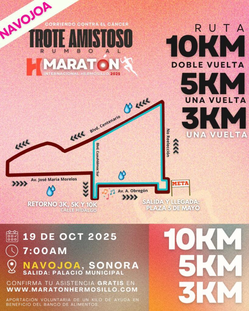 El Ayuntamiento de Hermosillo y el Comité Organizador de la 9ª Edición del Gran Maraton Internacional de Hermosillo A.C., invitan a participar a atletas y familias del sur de Sonora en el “Trote Amistoso Navojoa”, a realizarse el 19 de octubre.