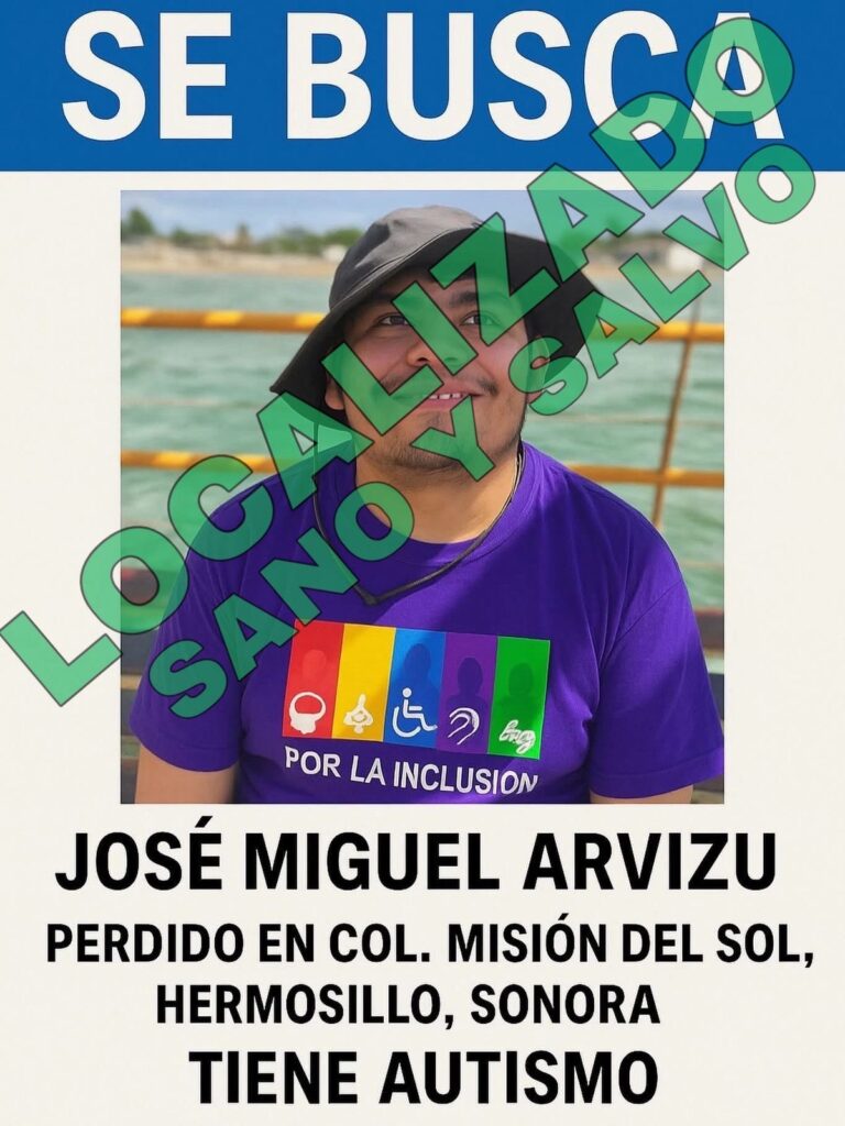 La Agencia Ministerial de Investigación Criminal (AMIC) informa que se localizó sano y a salvo a José Miguel, joven de 19 años con espectro autista, tras atender un reporte difundido en redes sociales que alertaba sobre su ausencia en Hermosillo.