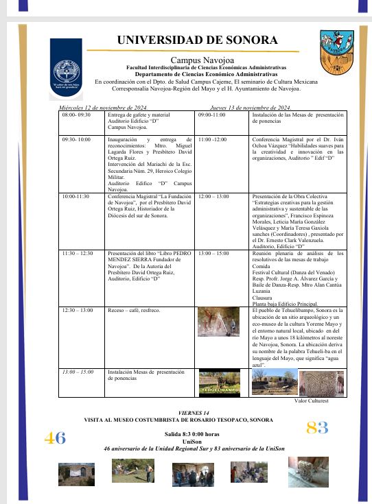El miércoles 12 denoviembre a las 9.30 horas será la inauguración de las actividades y la entrega de reconocimiento al profesor Miguel Lagarda Flores y al presbítero David Ortega Ruiz, quien ofrecerá la conferencia magistral “La fundación de Navojoa” y presentará su libro “Pedro Mendez Sierra. Fundador de Navojoa”. Finalmente, a las 13:00 horas será la instalación de mesas de presentación de ponencias.