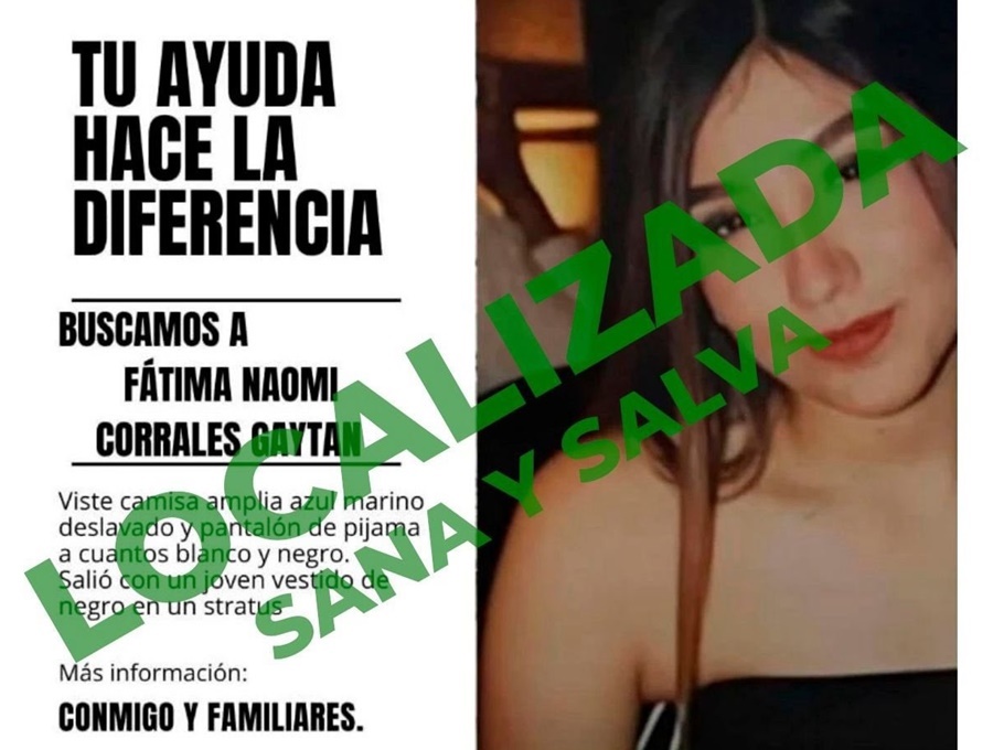 La Fiscalía General de Justicia del Estado de Sonora informa que fue localizada con vida Fátima Naomi “N” de 20 años de edad, previamente reportada como desaparecida, en hechos ocurridos este martes 30 de diciembre.