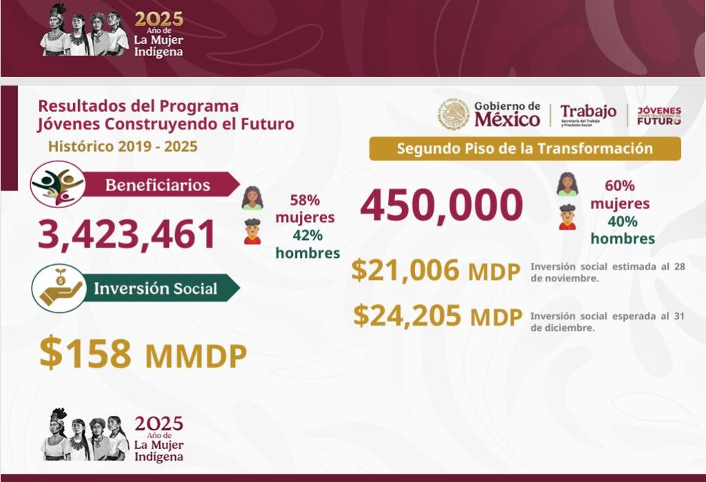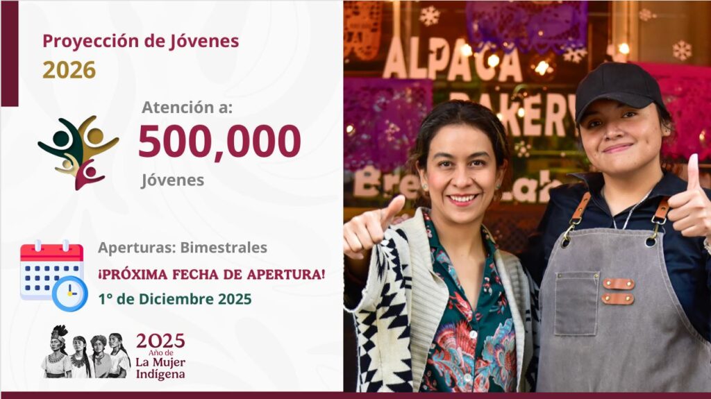 Añadió que la próxima fecha de inscripciones a Jóvenes Construyendo el Futuro es el 1 de diciembre de 2025 y se espera dar una atención a 500 mil personas.