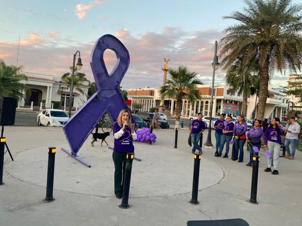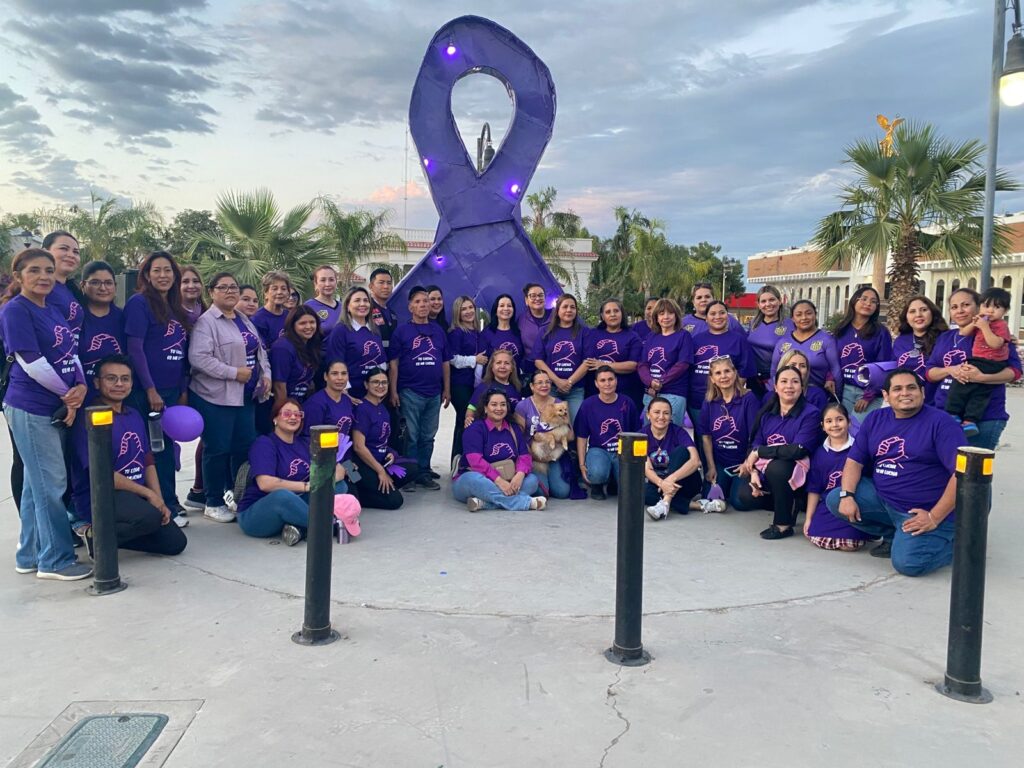 La caminata, organizada en el marco del Día Internacional, inició en la Plaza Santa Fe Springs y concluyó en la Plaza 5 de Mayo, lugar en donde también fue encendido un gran lazo de color morado.