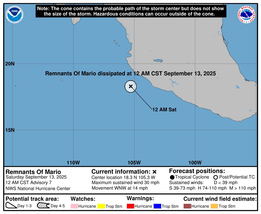 Protección Civil de Sonora informó que el sistema tropical denominado “Mario”, que amenazada con desarrollarse en un ciclón, se disipó frente a las costas de Michoacán, por lo que dejó de ser una amenazada para el territorio mexicano.