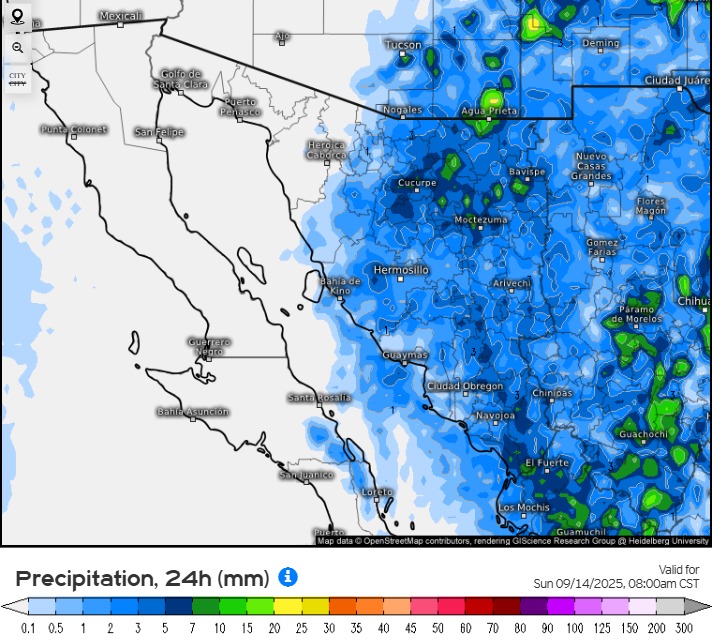 La dependencia estatal advirtió que los efectos del monzón mexicano seguirán manifestándose en la entidad, ya que su interacción con una vaguada en niveles medios y altos de la atmósfera ocasionarán tormentas eléctricas con lluvias ligeras a moderadas (5 a 25mm) y fuertes rachas de viento (+60 km/h) sobre el norte, centro, noreste, noroeste, este y sur en horario vespertino.