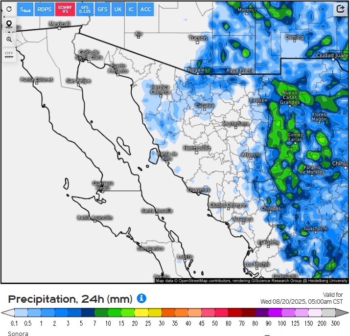 Durante hoy, y el resto de la semana, los efectos del monzón mexicano en combinación con inestabilidad atmosférica ocasionará tormentas eléctricas con lluvias de fuertes a muy fuertes (25 a 75mm) y fuertes rachas de viento (+60 km/h) sobre la mayor parte del estado en horario vespertino.