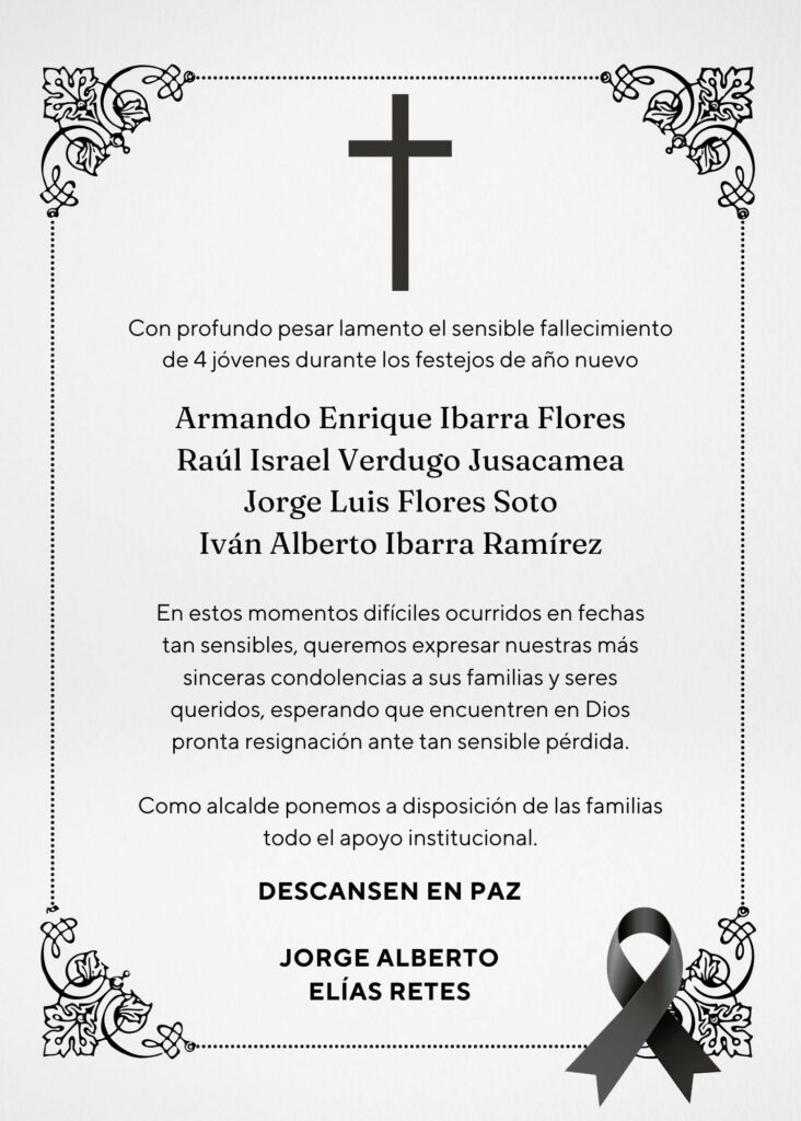 A través de una esquema que colocó en sus redes sociales, el alcalde de Navojoa, Jorge Alberto Elías Retes, identificó a las víctimas como: Armando Enrique Ibarra Flores, Raúl Israel Verdugo Jusacamea, Jorge Luis Flores Soto e Iván Alberto Ibarra Ramírez, cuyas edades fluctuaban entre los 23 y 27 años.