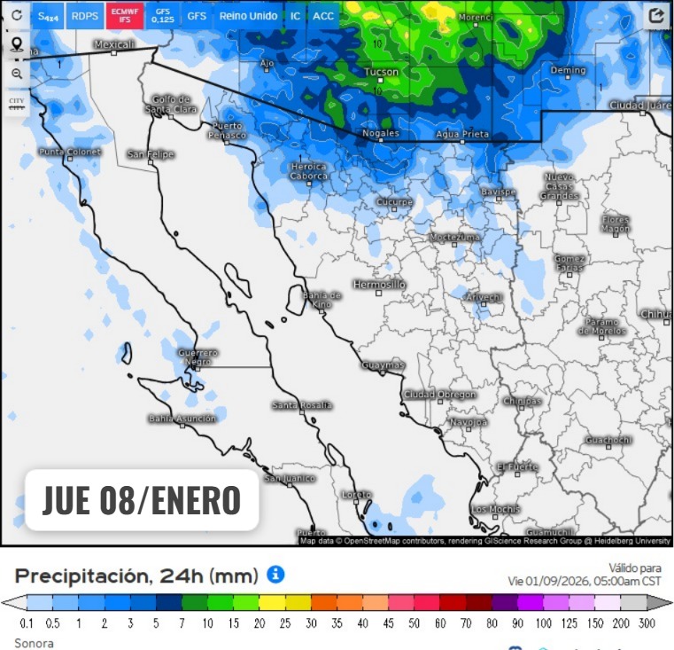 A su vez, un descenso en las temperaturas con valores mínimos que oscilen entre los -5 a los 0°C sobre la zona montañosa de Sonora.