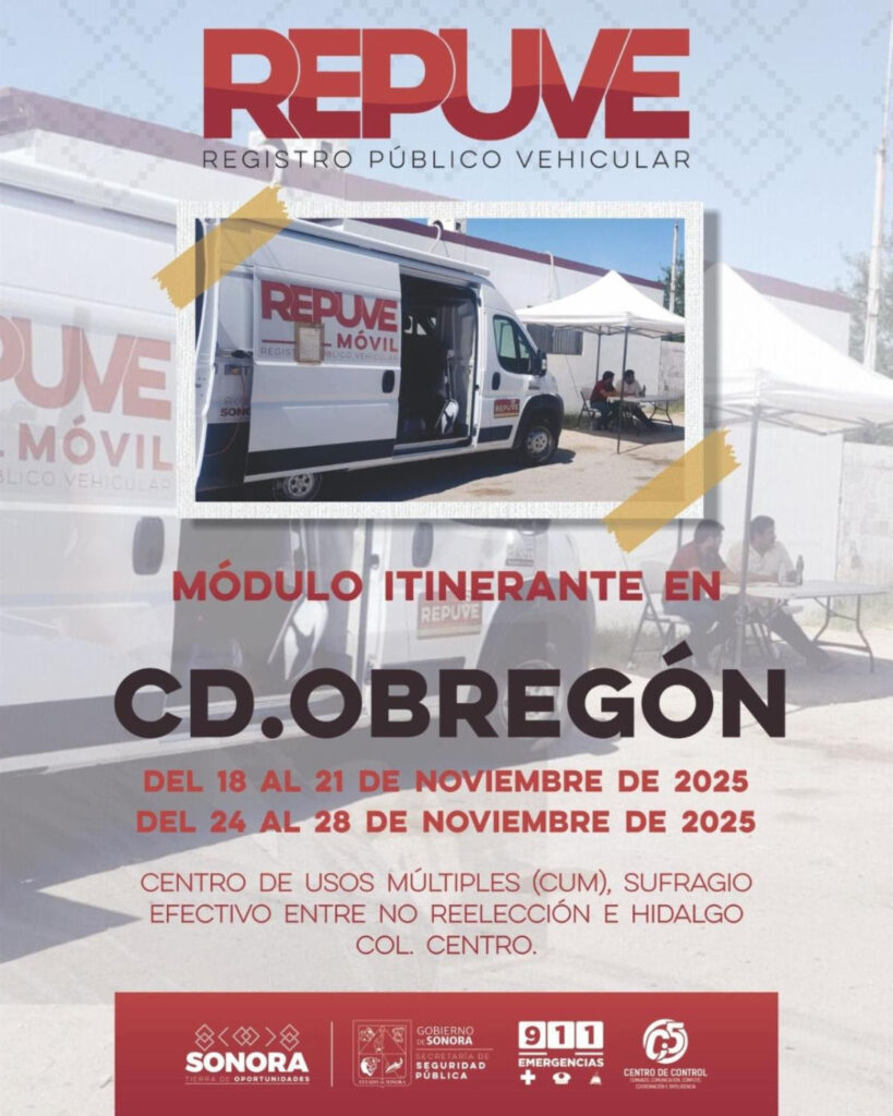 En apoyo a las y los habitantes de Ciudad Obregón interesados en realizar el trámite de regularización de autos usados de procedencia extranjera, se instalará el módulo itinerante del Registro Público Vehicular (Repuve) durante dos semanas, informó la Secretaría de Seguridad Pública (SSP) en Sonora.