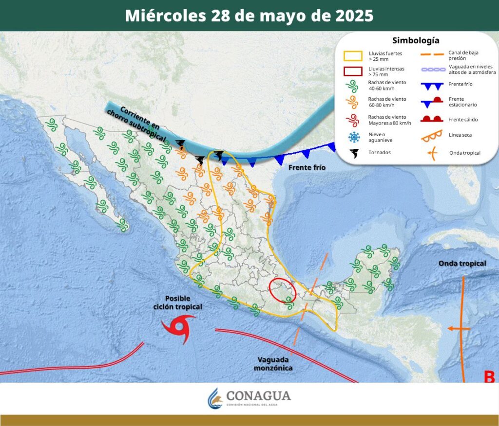 Durante hoy la corriente en chorro subtropical originará viento moderado con rachas de 40 a 60 km/h sobre municipios de la sierra.