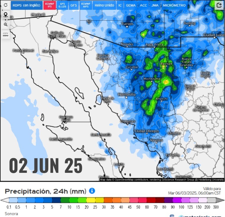 Durante hoy, continuará la circulación ciclónica en niveles altos de la atmosfera en combinación la corriente en chorro subtropical originando cielos parcialmente nublados con probabilidad de lluvia sobre todo el estado de Sonora y viento moderado con rachas de 40 a 60 km/h.