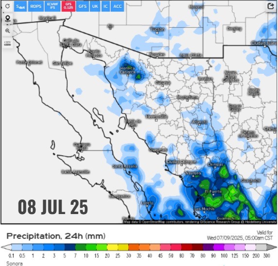 Por su parte, el patrón de circulación tipo monzón sobre el noroeste de México, originará chubascos y lluvias fuertes a muy fuertes acompañadas con descargas eléctricas y posible caída de granizo durante horario vespertino sobre municipios del oriente.