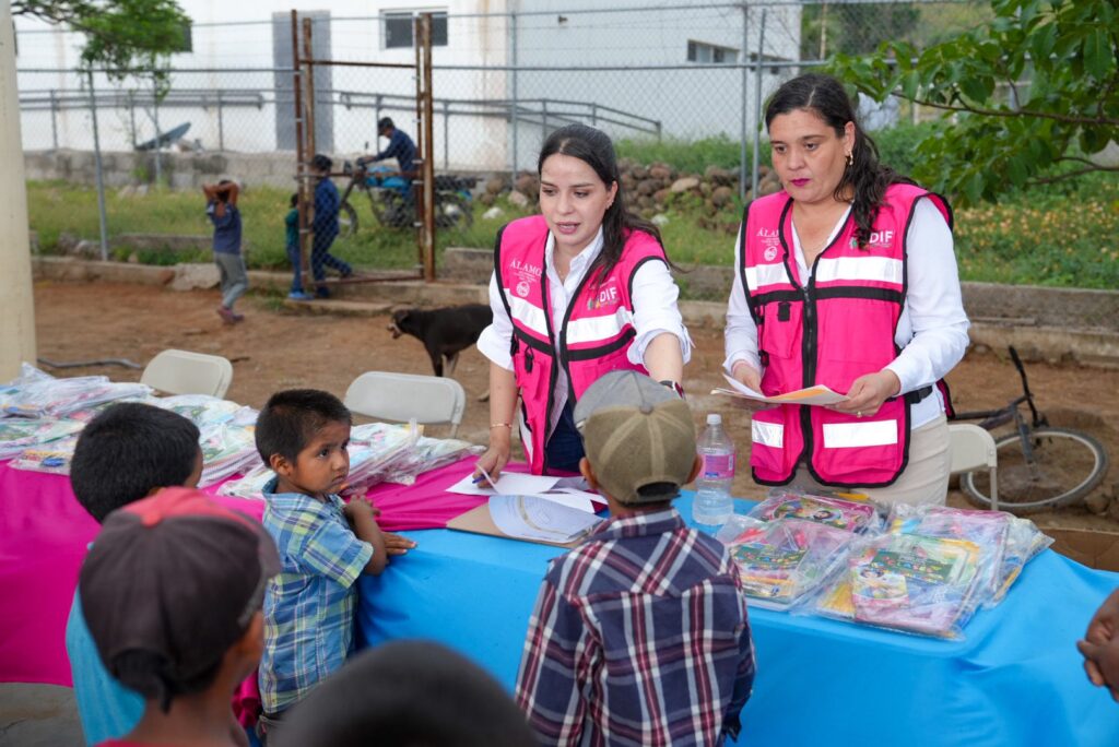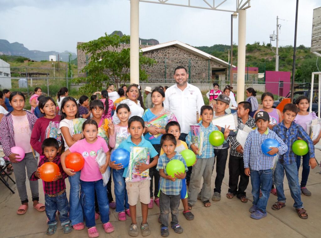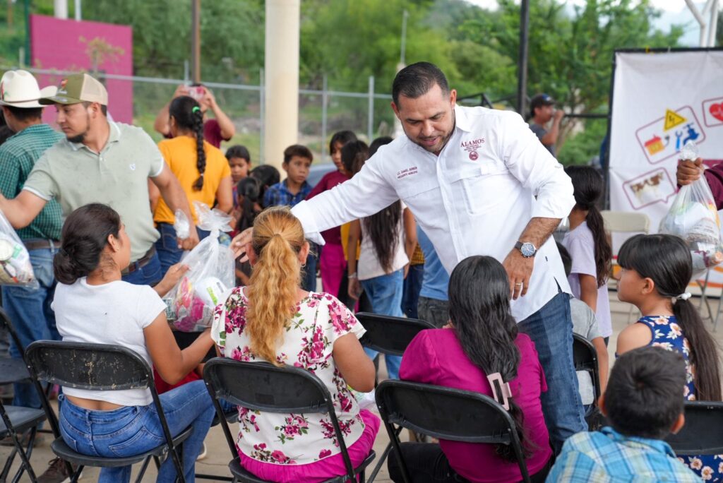 El presidente municipal de Álamos, Samuel Borbón Lara, acompañado por la presidenta de DIF municipal, Patricia Valenzuela Morales, visitaron las comunidades de Guajaray y Los Estrados, en donde entregaron útiles escolares, zapatos, mochilas, pelotas a niñas y niños, además de despensas para madres y padres de familia y alimento para ganado.
