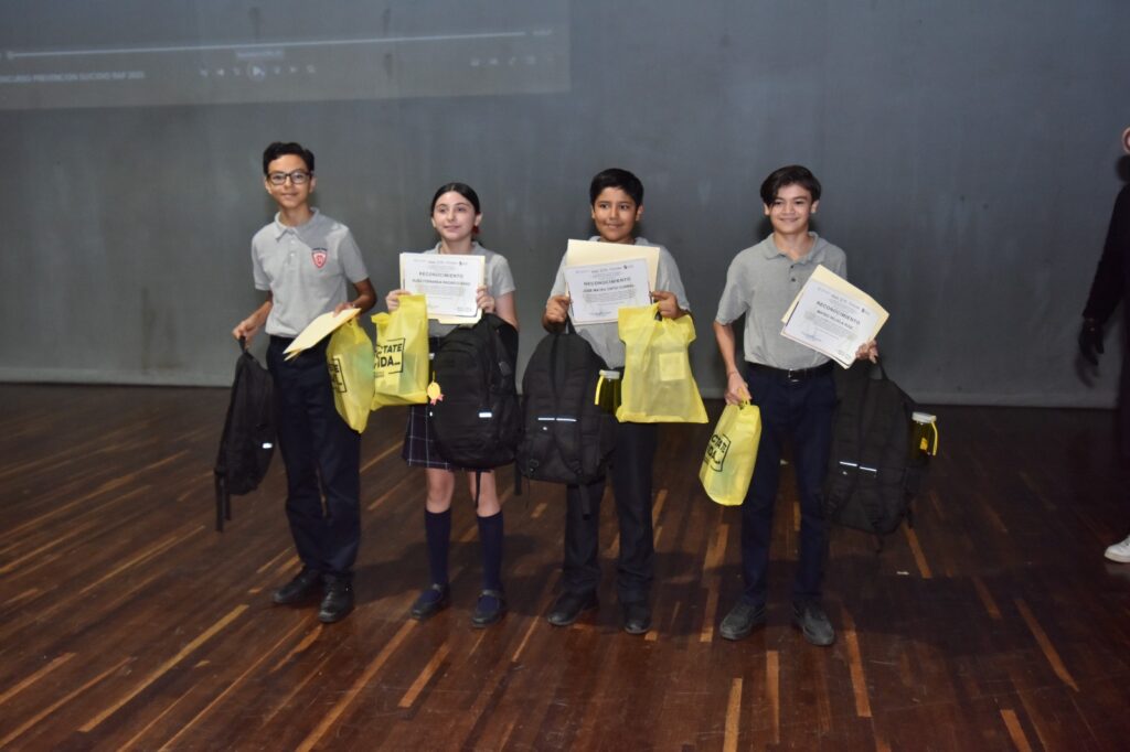 Presente también Gabriel Ramos Gallegos, encargado de Despacho del Distrito 5 de la SS, directores, maestros de varias instituciones educativas, y el grupo de alumnos del Colegio Bosco que con el tema musical y video “Nuevo Amanecer” ganaron el concurso para la identidad de estos foros estatales en su segunda edición, a quienes se les entregaron premios individuales.
