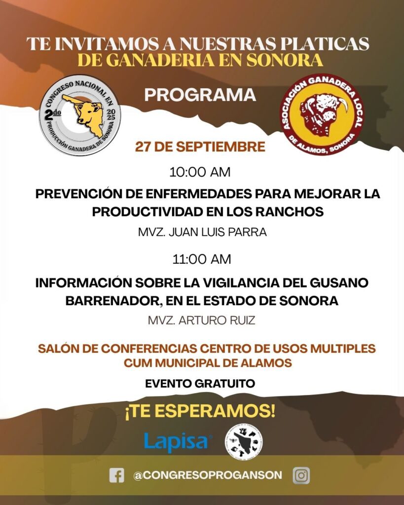 El programa contempla la conferencia “Prevención de enfermedades para mejorar la productividad en los ranchos”, a cargo de Juan Luis Parra, e “Información sobre la vigilancia del gusano barrenador en el estado de Sonora”, impartida por Arturo Ruiz.