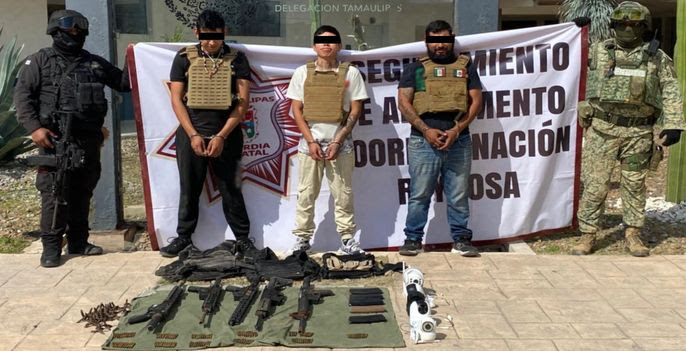 -En Reynosa, elementos del Ejército Mexicano y Policía Estatal detuvieron a tres hombres, les aseguraron cinco armas largas, cargadores, cartuchos, cinco cámaras de video vigilancia, seis chalecos tácticos y ponchallantas.