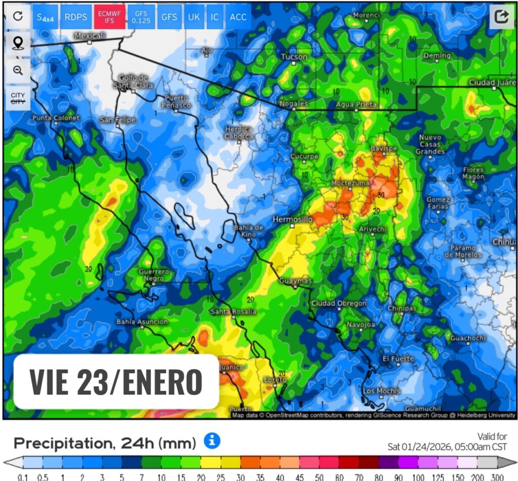 Y finalmente, se mantiene una probabilidad alta de caída de nieve y/o aguanieve sobre la región montañosa de Nogales, Santa Cruz, Cananea, Agua Prieta, Yécora y Nacori Chico.