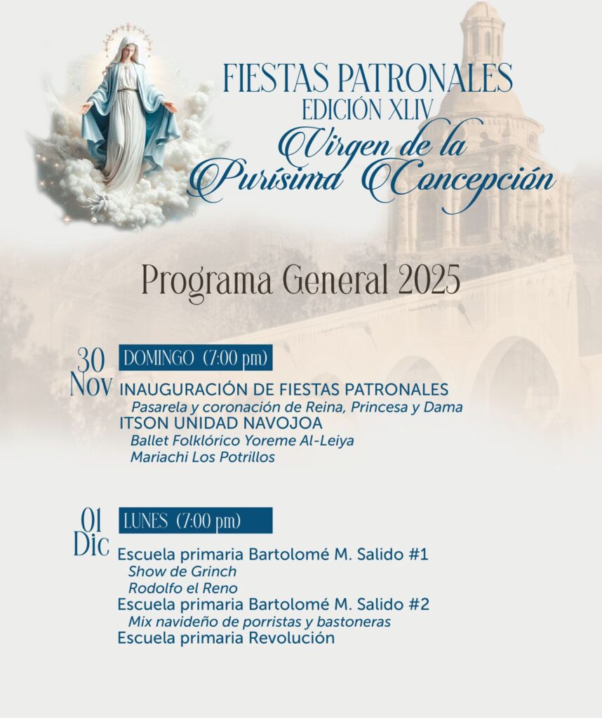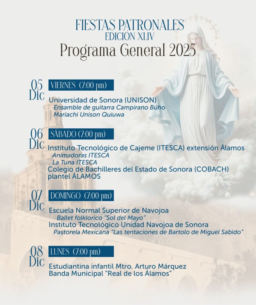 Álamos celebrarán las 44 Fiestas Patronales de la Virgen de la Purísima Concepción, su santa patrona, con una serie de eventos a realizarse del 30 de noviembre al 07 de diciembre.