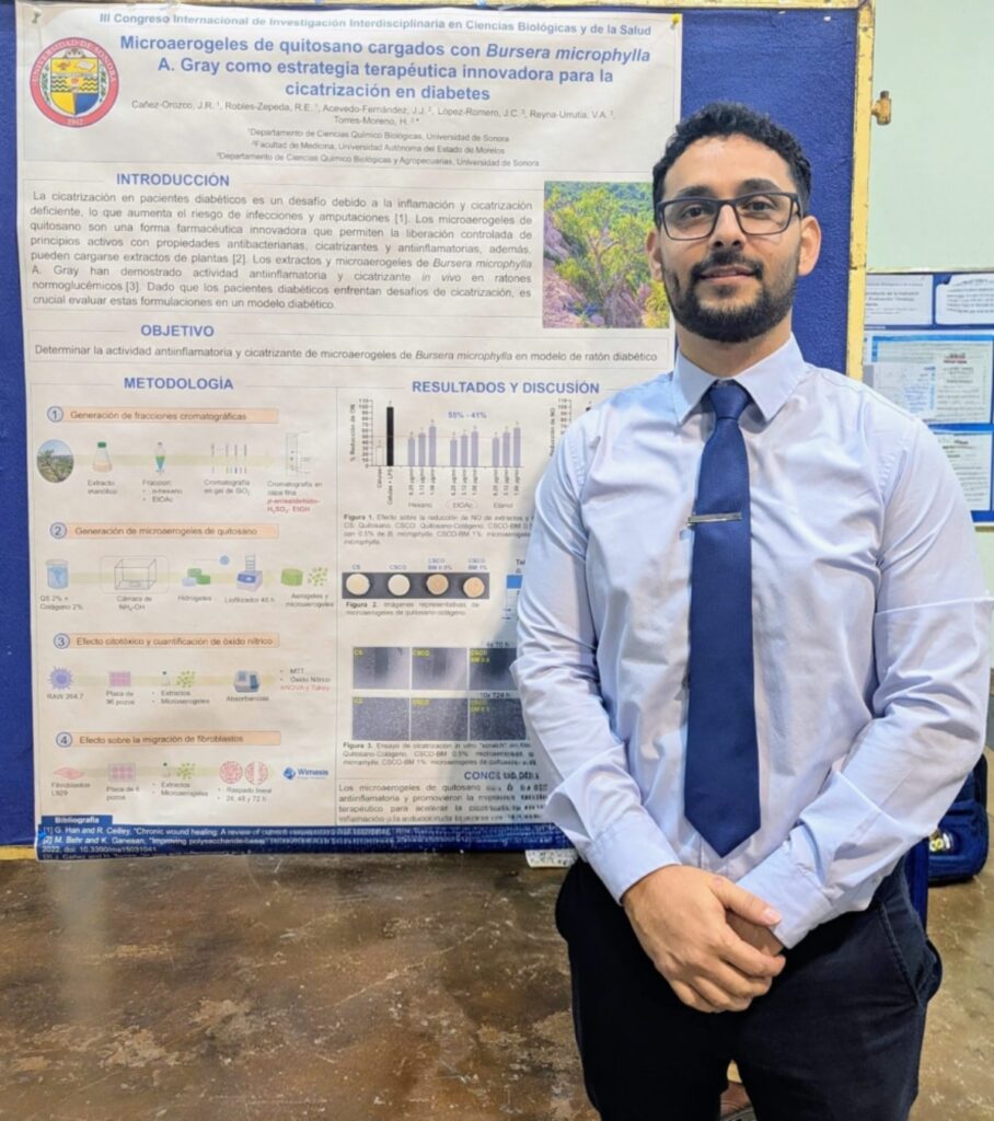 Con el objetivo de atender una de las complicaciones más frecuentes de la diabetes, Juan Ramón Cañez Orozco, estudiante del Doctorado en Ciencias Químico Biológicas y de la Salud de la Universidad de Sonora, desarrolla una investigación centrada en el uso de biomateriales avanzados para mejorar los procesos de cicatrización en pacientes con esta condición.
