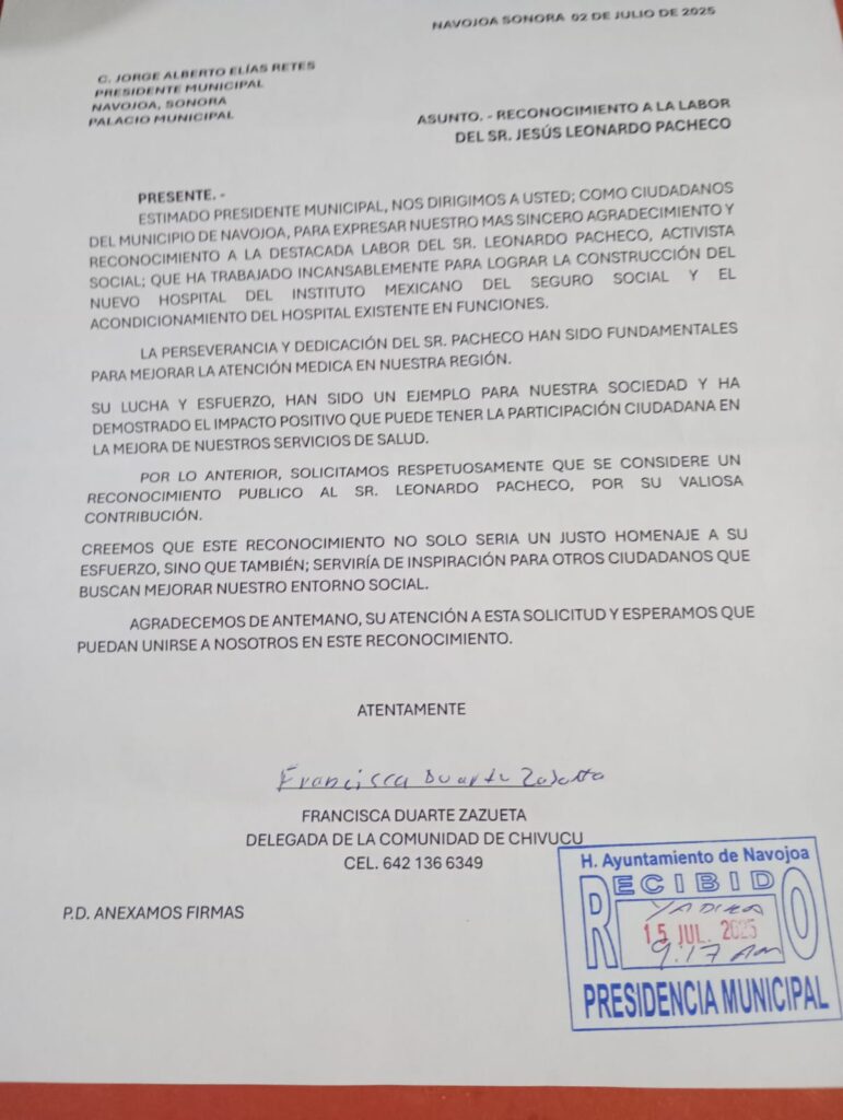 “La perseverancia y dedicación del Sr. Pacheco han sido fundamentales para mejorar la atención médica en nuestra región. Su lucha y esfuerzo han sido un ejemplo para nuestra sociedad y ha demostrado el impacto positivo que puede tener la participación ciudadana en la mejora de nuestros servicios de salud”, señala el escrito firmado por Francisca Duarte Zazueta, delegada de la comunidad de El Chivucú, perteneciente a la comisaría de Tesia.